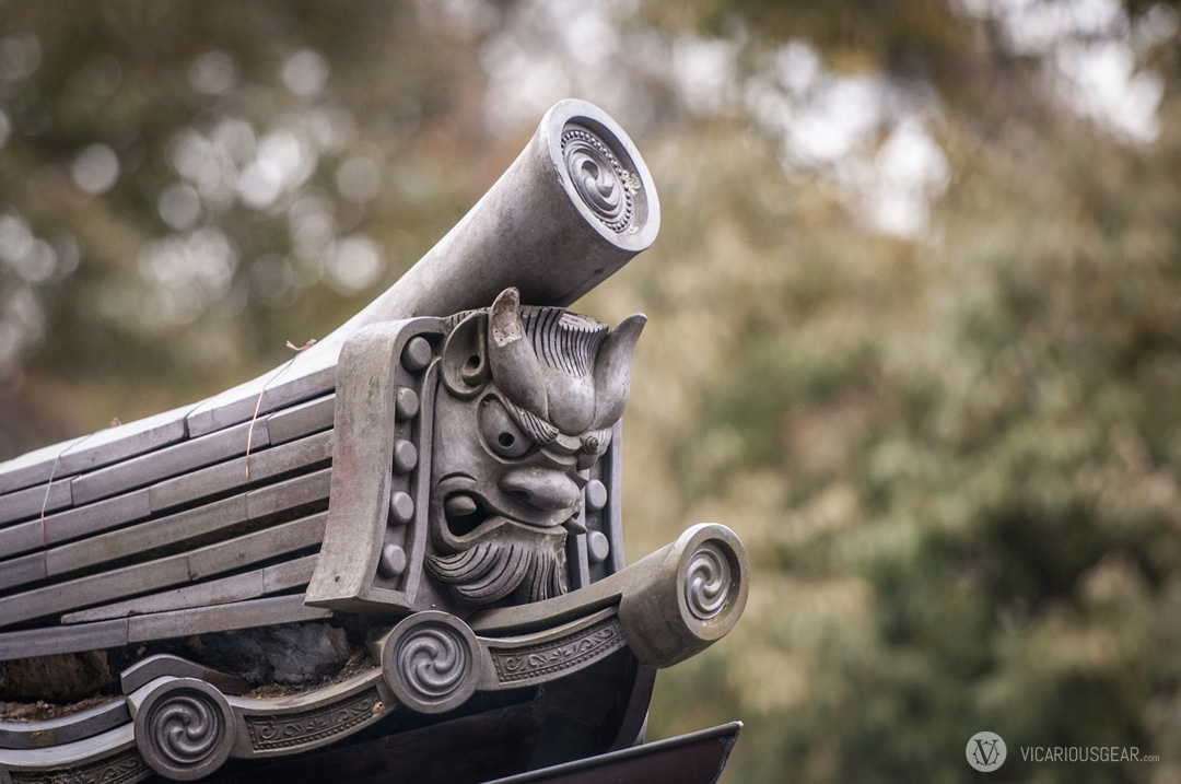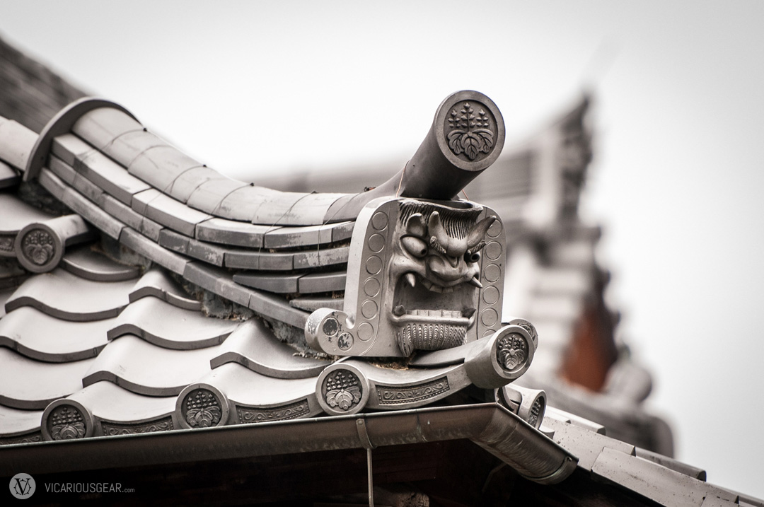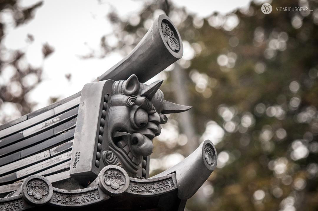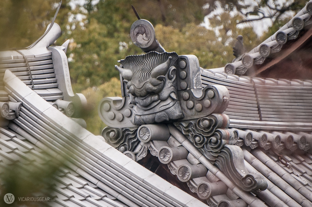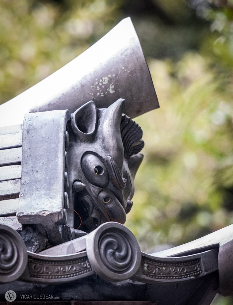 In a previous post, I mentioned my growing infatuation with rooftop decorations spotted at Japanese shrines and temples. More specifically, the onigawara 鬼瓦 (“demon” or “goblin tile”) variety with their limitless styling variations. While exploring the Kinkaku-ji temple in Kyoto, I discovered a ton of these design curiosities. Apparently they are intended to ward off evil spirits of fire.