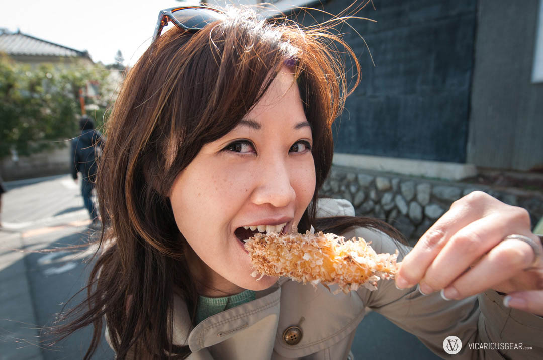 Mimi snacking on some bonito flake covered grilled mochi balls. It looks like a fried chicken tender…