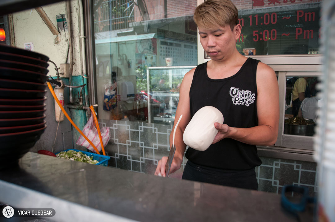 On the second day of our Taiwan trip we were on our own for lunch so we decided to try knife cut noodles (in beef noodle soup) for the first time at Shan Xi Knife Cut Noodles (山西刀削麵). As we approached, it was interesting to find the kitchen was actually two food carts outside of the actual storefront. That turned out to be nice for us because it was cool to see the noodles being lopped off a chunk of dough by the chefs cleaver.