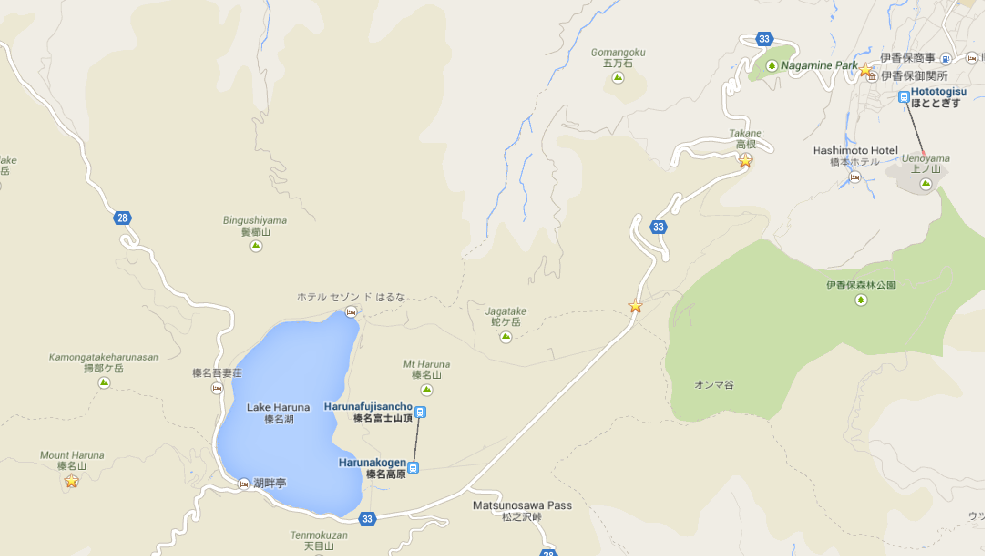 I’ll start off with a map of the area. Aside from Mt Haruna, the other 3 stars are important spots on the road with the center star (near Takane) being the viewing location for the 5 hairpin turns.